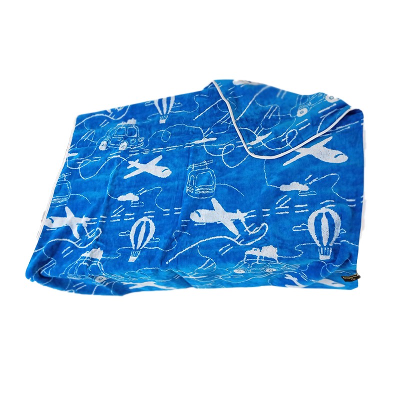 Бебешка хавлия с качулка със самолети, балони и колички на марката BULGARIA TEX в тъмносин цвят и с размери 100x100 см.Хавлията е изработена от 100% памук с плътност 430 гр/м², нежна и приятна на допир и изключително деликатна към детската кожа. Изделието се отличава с изключителна мекота и висока попиваемост. Притежава OEKO Текс сертификат за качество, който ще осигури комфорт за най-малките.