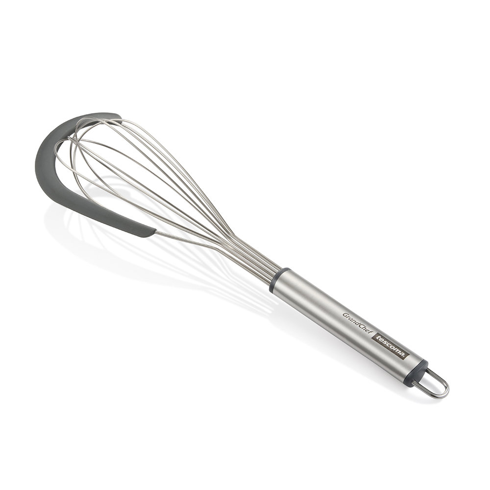 Предназначена за разбиране, но и много удобна за обиране на залепналите по стените на купата тесто или крем заради гъвкавата вградена шпатула
