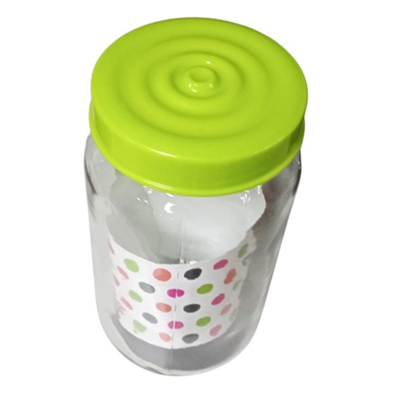Стъклен буркан с пластмасов цветен капак на марката HEREVIN, подходящ за съхранение на ядки, варива, зърнени храни и др. хранителни продукти.Бурканът е с вместимост 1 л. Подредете функционално кухнята си и се погрижете за съхранението на хранителните продукти с красиви буркани с цветни капачки.