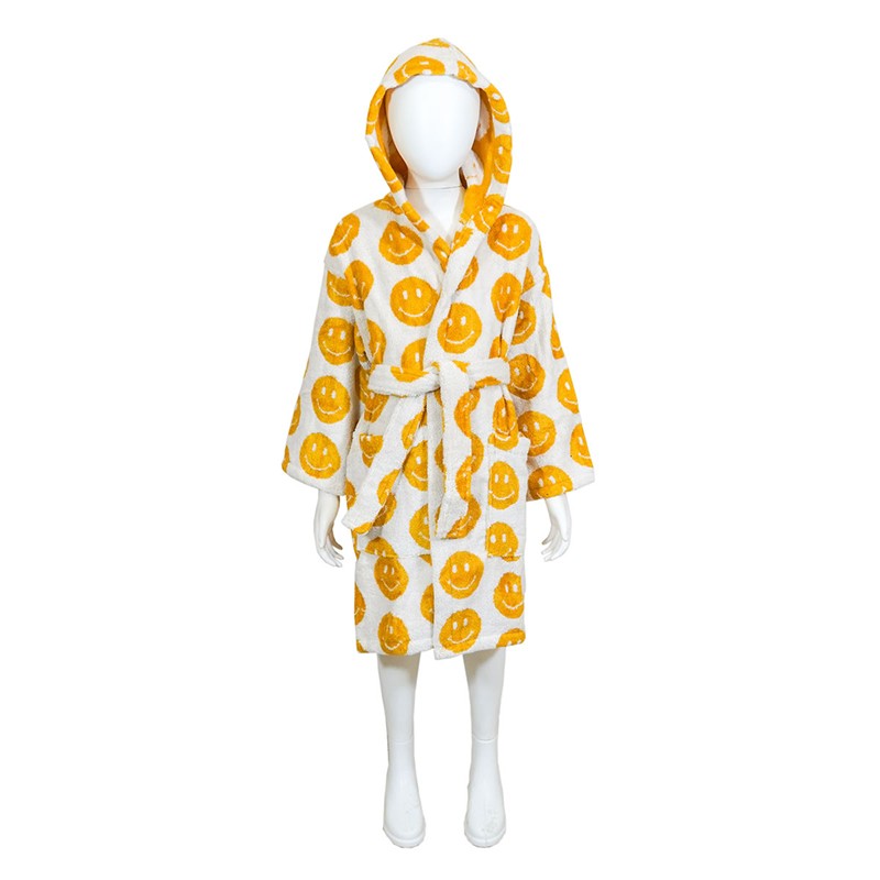 Детски халат Smile на марката BULGARIA TEX с емотикони усмивки, подходящ за деца на възраст 6-8 години.Разполага с качулка, колан за регулиране на ширината и странични джобове.Халатът е съставен от 70% памук и 30% вискоза.Характеризира се с изключителна мекота и висока попиваемост.Зарадвайте детето си с оригинален халат с доказано качество на български производител. Предлага се в два варианта - с жълти емотикони и с пъстри емотикони.*Доставя се с подаръчна кутия.