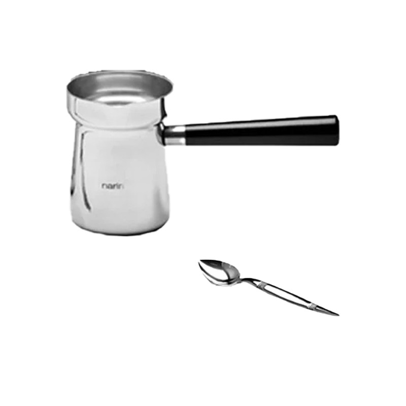 Джезве за кафе Monaco на турската марка NARIN с вместимост 440 мл, изработенo от неръждаема стомана в сребрист цвят. Има специален улей за изливане без капки.Снабдено е с топлоустойчива дръжка, която предпазва ръката от топлината.Джезвето е устойчиво на корозия и може да се мие в съдомиялна машина.Предлага се с лъжичка.