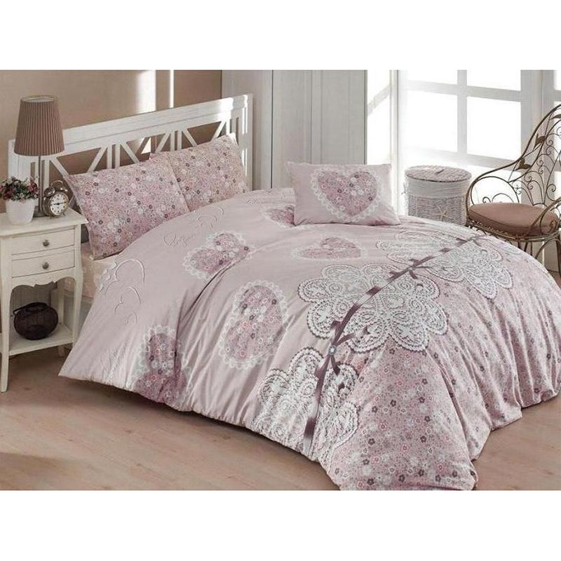Единичен спален комплект от 3 части на турската марка ZAMBAK с десен на сърца и цветя, изработен от 100% памук.Комплектът включва плик с размери 160x220 см, долен чаршаф с размери 180x240 см и калъфка с размери 50x70 см.Качествено спално бельо в нежно розово, което ще създаде романтично настроение и ще допринесе за стилния и модерен вид на вашата спалня.Осигурете си спокоен сън и пълноценна почивка с този красив спален комплект.
