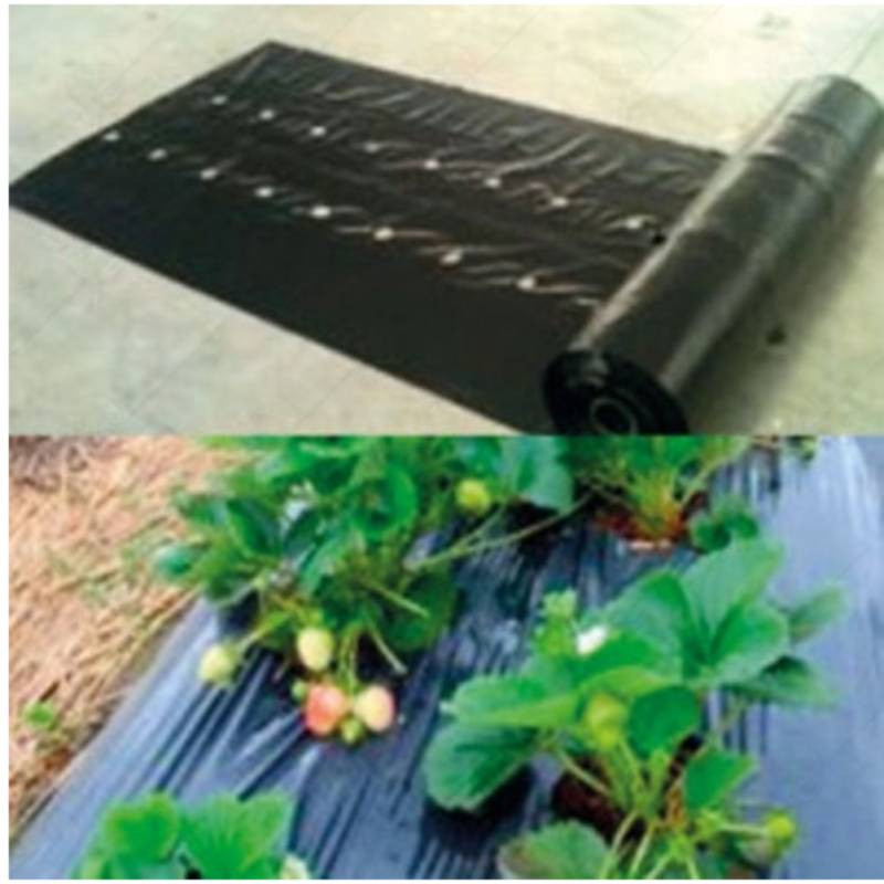 Черен найлон за ягоди, изработен от полиетилен.Представлява плътно черно фолио за мулчиране с шахматно разположени дупки с отвор 35 мм и разстояние между тях по диагонал - 35 см.Найлонът предпазва от изпаряване на влагата от почвата и намалява необходимостта от поливане до 50%.Не позволява поникване на плевели в покритата част, което намалява разходите на труд до 50-60%.Предпазва от измиването на хранителни вещества от почвата.Намалява загниването на плодовете до 2 пъти, което от своя страна повишава добива 2 пъти.Характеризира се със защита 1% UV.
