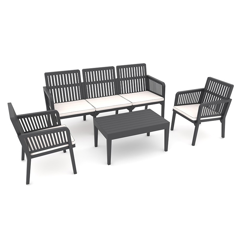 Стилен градински комплект Lizbon Lounge Set на турския производител RAINBOW в цвят антрацит, съдържащ маса, триместен диван и две кресла.Комплектът е подходящ както за домашна употреба, така и за места като кафенета, заведения, ресторанти и хотели.Мебелите са изработени от висококачествен полипропилен, подсилен със стъклени влакна за по-голяма издръжливост.Материалът е устойчив на UV-лъчи и различни атмосферни условия. Креслата и диванът са снабдени с водоотблъскващи меки възглавници.Мебели с атрактивен и елегантен дизайн, които ще допринесат за приятната атмосфера във всяко открито пространство.Създайте пространства, които ще ви съберат с любимите хора.Комплектът е лесен за сглобяване (клик система) и за почистване.