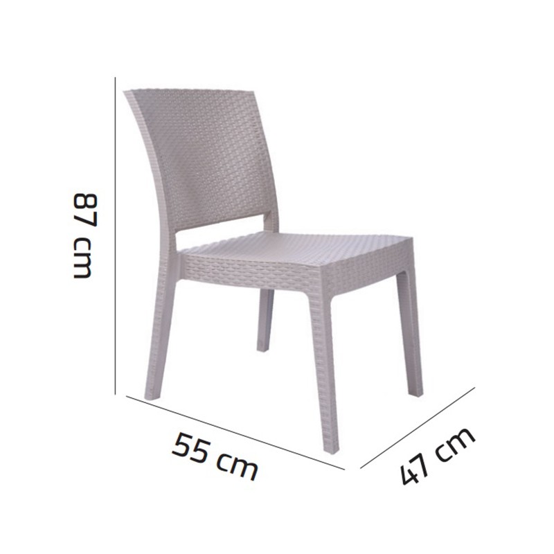 Изработен от висококачествен и устойчив PVC материал, столът е създаден да издържа на всякакви атмосферни влияния, което го прави изключително подходящ за външна употреба. Липсата на подлакътници придава на стола по-компактен вид и го прави лесен за подреждане и съхранение, особено когато пространството е ограничено. Неговата стабилна конструкция и ергономична форма гарантират сигурност и удобство през целия ден. Този модел е чудесен избор както за самостоятелна употреба, така и за допълнение към съществуващи мебели.