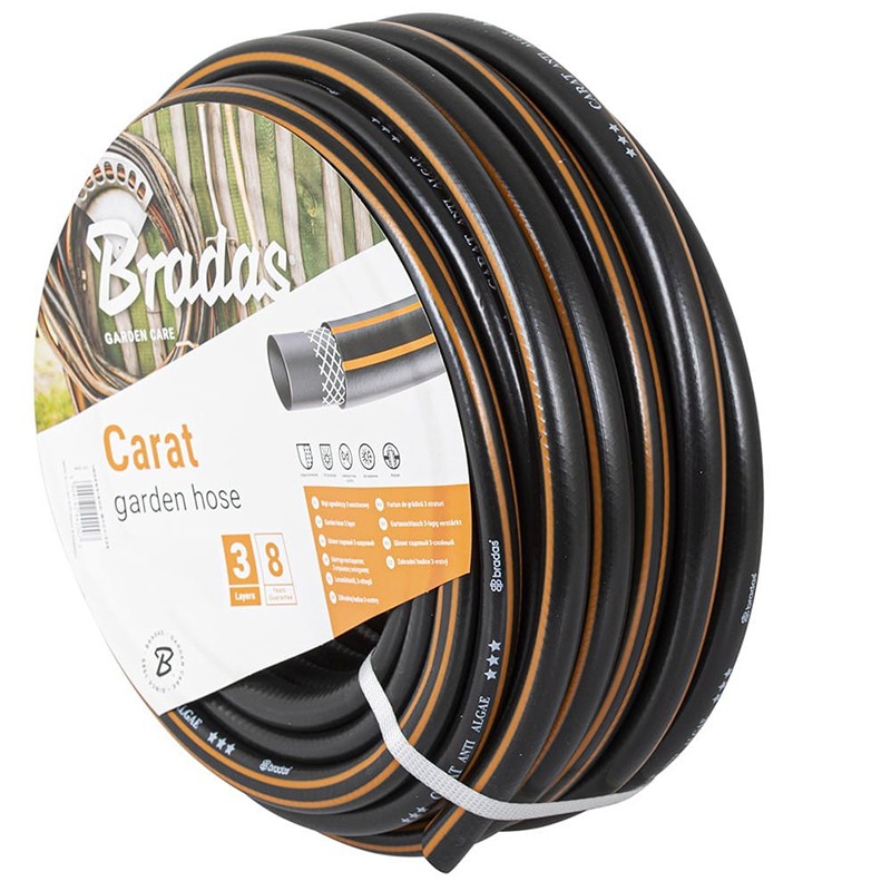 Градински трислоен подсилен маркуч Carat на марката BRADAS, изработен от гъвкав PVC материал с повишено тегло и устойчивост.Вътрешният слой на маркуча е съставен от черен PVC материал, устойчив на UV лъчи и анти-водорасли.Вторият слой е оплетка от синтетични влакна.Външният слой е изработен от гъвкав PVC материал, в черен цвят с две оранжеви ивици, и предпазва маркуча от протриване.Маркучът е с дължина 25 м и диаметър 3/4" (19 мм).Проектиран е за максимално налягане от 8 bar.
