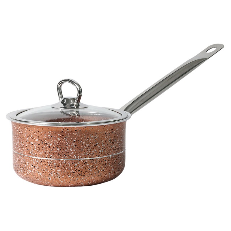 Алуминиева касерола SN379 на турския производител MENZIR с незалепващо гранитно покритие, предназначена за варене на мляко.Съдът е снабден със стъклен капак с отвор за парата и с дълга метална дръжка. Касеролата е с диаметър 14 см. Гранитните тенджери се смятат за едни от най-надеждните и здрави съдове.Те са издръжливи, устойчиви на надрасквания и удари, почистват се и се измиват лесно.