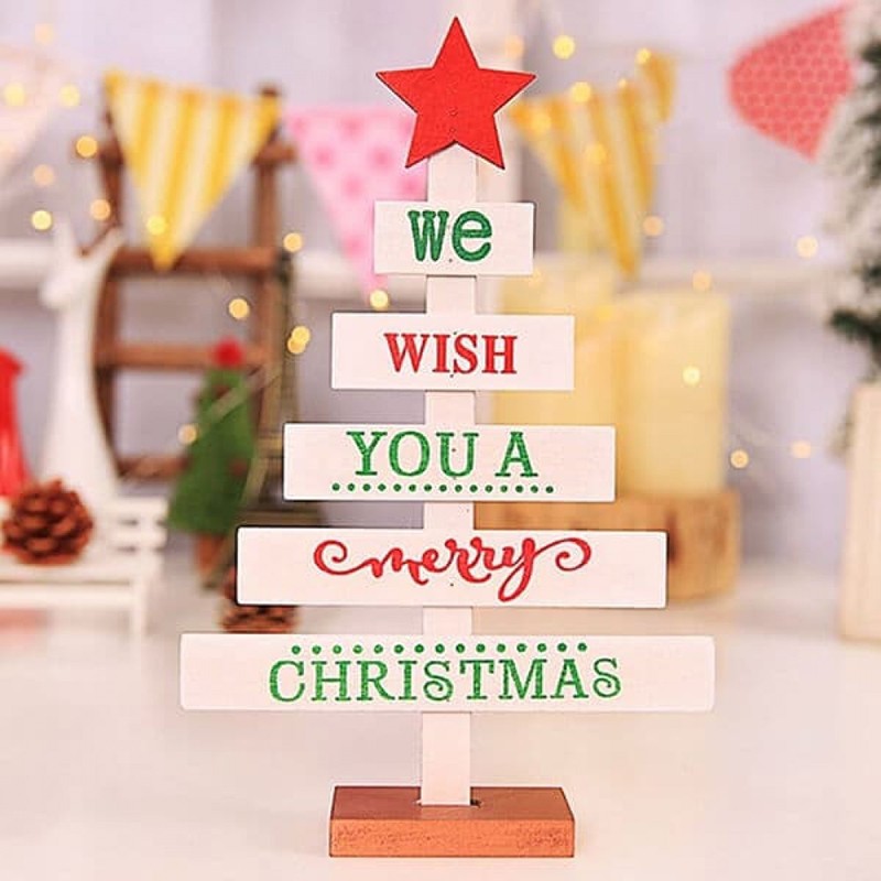 Декоративна коледна елха с надписи, подходяща за украса у дома или на работното място.Декоративната елха е изработена от дърво и е с височина 28 см. Създайте неповторима коледна атмосфера у дома или зарадвайте близък или приятел с тази красива коледна елха с оригинален дизайн.