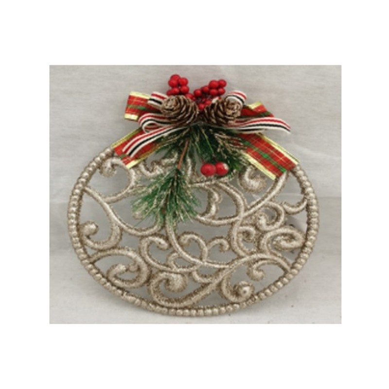 Коледна фигура за украса на елха или декорация, изработена от пластмаса и текстил.Фигурата представлява клончета в кръг, украсен с панделки, зелени клонки, шишарки и клонки имел.Коледната фигура е с диаметър 18 см.Внесете коледен дух у дома или зарадвайте близък или приятел с красива коледна украса.