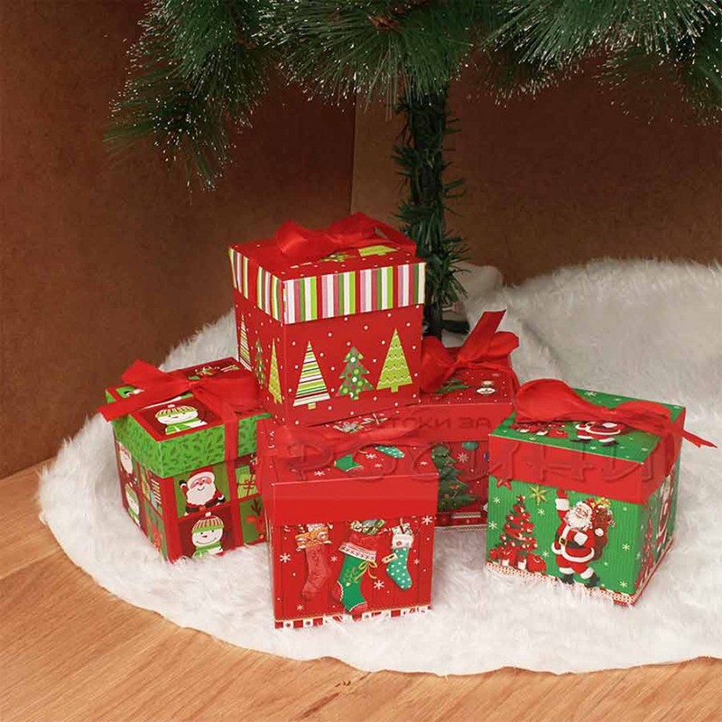 Коледна кутия за малки подаръчета и лакомства, изработена от хартия и декорирана с червена панделка.Кутията е с размери 15x15 см.*Снимката е илюстративна. Възможни са вариации на картинките.