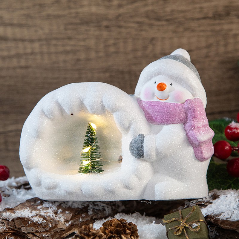 Коледна светеща декорация - Снежен човек с елха, съчетаваща практичност и свеж дизайн.С включването на светлинните акценти този снежен човек ще създаде уют и приказно настроение във вашия дом.Керамичната декоративна фигурка е с размери 15x7x11 см и тегло 300 грама.Захранва се с две батерии LR44 (батериите са включени в цената).