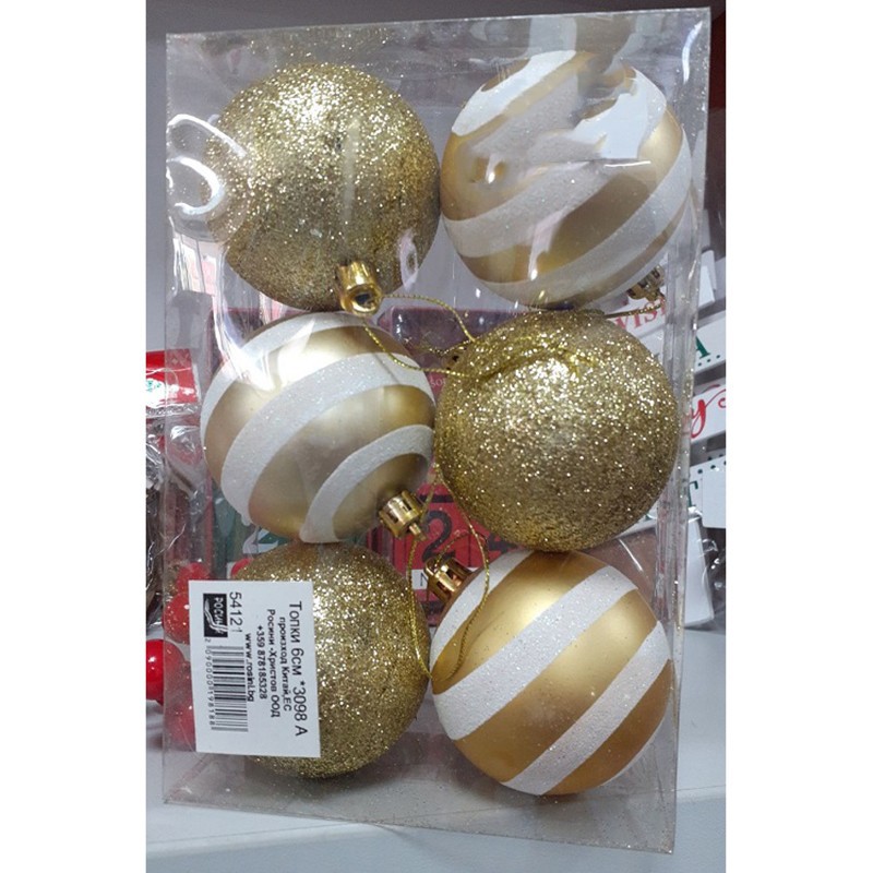 Красиви коледни топки в златист и бял цвят за украса на коледна елха.Топките са изработени от пластмаса и са с диаметър 6 см.Предлагат се в комплект от 6 броя - три златисти топки брокат и три бели топки със златисти райета.Украсете коледната елха с красиви и ефектни коледни топки и си подарете вълшебна Коледа.