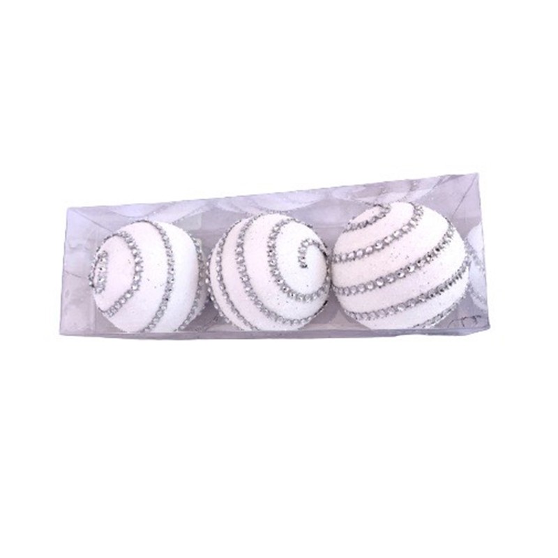 Комплект от три изящни коледни топки, предназначени за украса на елха.Топките са в бял цвят и със сребристи ивици, с диаметър 8 см.Внесете коледен дух у дома и се погрижете за бляскавата украса на вашата елха със стилни коледни топки.