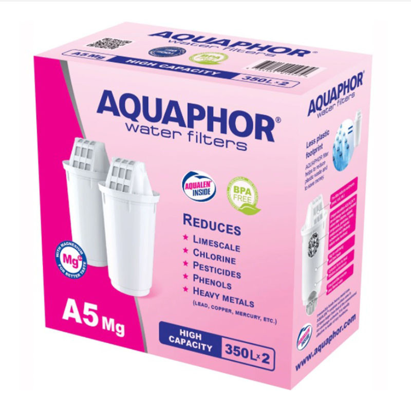 Комплект от два броя от новите филтри за вода Aquaphor А5 MG+, създадени специално за силно-замърсена вода, която съдържа големи количества механични примеси като ръжда, пясък, утайка.Дори в тези условия А5 MG+ не се задръства преждевременно и продължава да пречиства водата от хлор и други разтворими примеси.Филтърът Aquaphor А5 прави водата безопасна и приятна на вкус и предотвратява образуването на котлен камък, премахвайки излишния калций, като така кафето или чаят, приготвени с филтрираната вода, не губят своите натурални вкусове.Също така филтърът Aquaphor A5 Mg+ обогатява филтрираната вода с оптимални количества магнезий, който е полезен за сърцето и кръвоносните съдове.Защитава Вашия чайник, кафемашина или мултикукър от прегряване и счупване с 50% по-голяма ефективност отколкото филтрите на други производители.Конструкцията на филтъра му позволява да се самопречиства всеки път, когато напълвате каната.По този начин няма да се налга подмяната му много често.Имайки предвид увеличения ресурс, филтърът може да прослужи до 3 месеца в тричленно семейство.Съвместим е с кани Арктик, Престиж, Премиум, Ултра, Прованс, Триумф.Повече от 13,5 милиона семейства в 35 страни вече се възползват от използването на продуктите на Aquaphor.