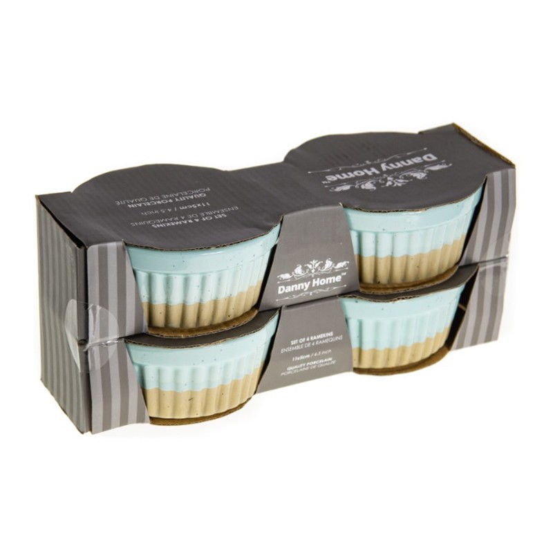 Комплект от четири форми за суфле Danny Home, с които вашите десерти ще придобият още по-привлекателен вид.Съдовете са изработени от високо устойчива керамика, в два преливащи цвята и напръскани с точки.Устойчиви са на температури до 230°C.Формите са с диаметър 11 см и височина 5 см. Подходящи са за съдомиялни машини, микровълнови фурни, фурни и фризери.
