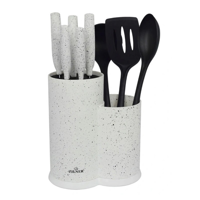 Комплект ножове и прибори за сервиране ZL 5129 ZILNER със стойка, съдържащ 8 части.Ножовете са с остриета от висококачествена неръждаема стомана и са лазерно заточени, което гарантира дълъг експлоатационен живот. Ножовете и приборите са с ергономична дръжка за по-добър комфорт и захват.Комплектът ZL 5129 ZILNER съдържа универсален нож с дължина 20 см, нож за хляб с дължина 20 см, нож на готвача с дължина 20 см, универсален нож с дължина 12.7 см, нож за белене с дължина 9 см, черпак, лъжица за сервиране, решетъчна лъжица и стойка.Ножове и прибори, които ще ви помогнат да реализирате кулинарните си възможности.