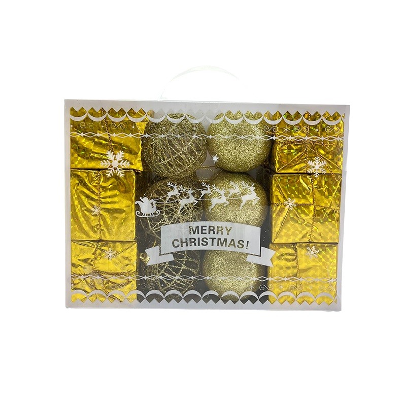 Комплект от 12 коледни топки и подаръчни кутийки в златист цвят, предназначени за украса на елха.Топките в комплекта са два модела: брокатени и тип мрежа.Внесете коледен дух у дома и се погрижете за бляскавата украса на вашата елха с оригинални коледни топки и красиви подаръчни кутийки.