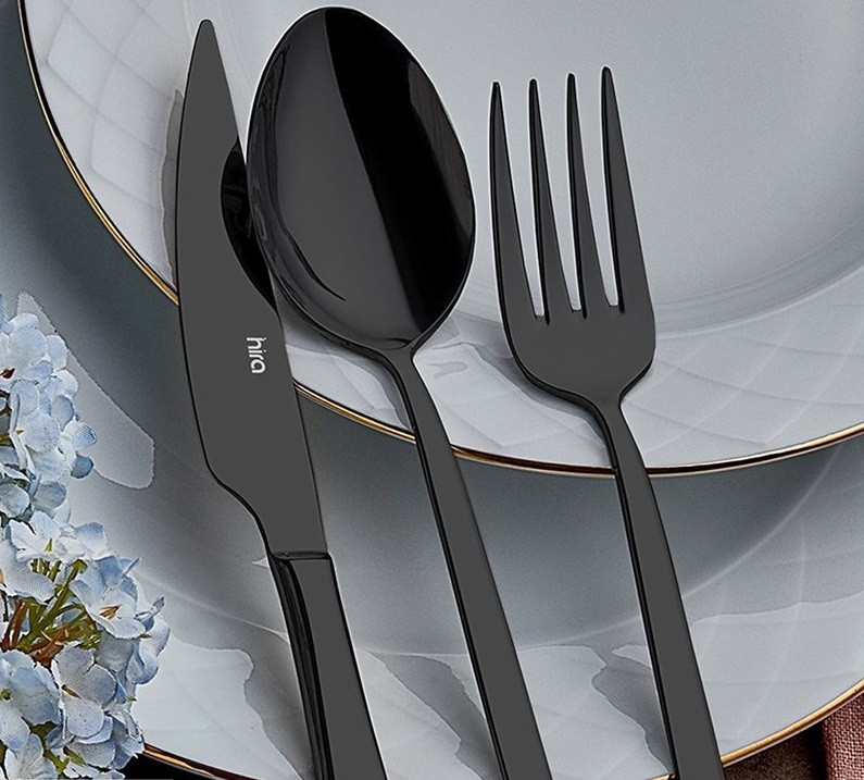 Комплект прибори от 18 части от серията Istanbul на турската марка HIRA в черен цвят и с матирано покритие, подходящ за шест души.Комплектът съдържа 6 лъжици, 6 вилици и 6 ножа.Приборите са изработени от неръждаема стомана тип 304 (с дебелина 3 мм при вилиците и лъжиците и 10 мм при ножовете).Отличават се с модерен външен вид, здравина и дълъг експлоатационен срок.При спазване на препоръките за употреба приборите запазват своя впечатляващ вид както в първия ден.Вилиците и лъжиците са с дължина 21 см, а ножовете са дълги 22 см.