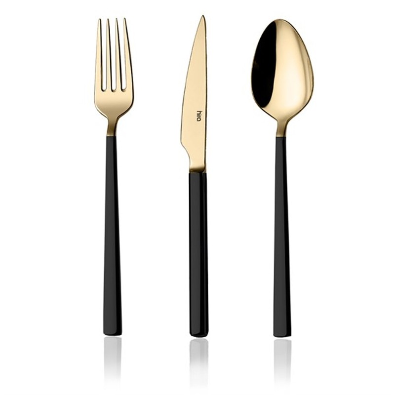 Комплект прибори от 18 части от серията Cubuk на турската марка HIRA с атрактивна визия, подходящ за шест души.Комплектът съдържа 6 лъжици, 6 вилици и 6 ножа, в цвят злато и черно и с покритие тип седефено.Приборите са изработени от неръждаема стомана тип 304 (с дебелина 3 мм при вилиците и лъжиците и 10 мм при ножовете).Отличават се с естетичен дизайн, модерен външен вид, здравина и дълъг експлоатационен срок.Имат отлична устойчивост на корозия, лесни са за миене и съхранение.Балансираното тегло и гладката повърхност осигуряват естетическо удоволствие при захващане и комфорт при държане на приборите.Комплектът е подходящ както за домашна употреба, така и за семейни събирания, сервиране на партита и др. Идеален е както за дома, така и за сватби или други празнични събития.Перфектен подарък за младо семейство или приятели.При спазване на препоръките за употреба приборите запазват своя блясък и стилен вид както в първия ден.Лъжиците и вилиците са с дължина 20.7 см, а ножовете са дълги 22 см.