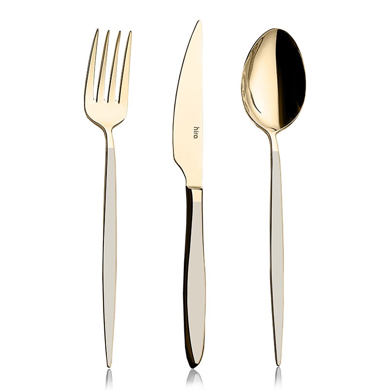 Комплект прибори от 18 части от серията Istanbul на турската марка HIRA с изискан дизайн, подходящ за шест души.Комплектът съдържа 6 лъжици, 6 вилици и 6 ножа, в златист цвят злато и с матирани дръжки.Приборите са изработени от неръждаема стомана тип 304 (с дебелина 3 мм при вилиците и лъжиците и 10 мм при ножовете), която запазва блясъка си дълго време.Отличават се с модерен външен вид, здравина и дълъг експлоатационен срок.Имат отлична устойчивост на корозия, лесни са за миене и съхранение.Балансираното тегло и гладката повърхност осигуряват естетическо удоволствие при захващане и комфорт при държане на приборите.Комплектът е подходящ както за домашна употреба, така и за семейни събирания, сервиране на партита и др. Идеален е както за дома, така и за сватби или други празнични събития.Перфектен подарък за младо семейство или приятели.При спазване на препоръките за употреба приборите запазват своя блясък и стилен вид както в първия ден.Вилиците и лъжиците са с дължина 21 см, а ножовете са дълги 22 см.