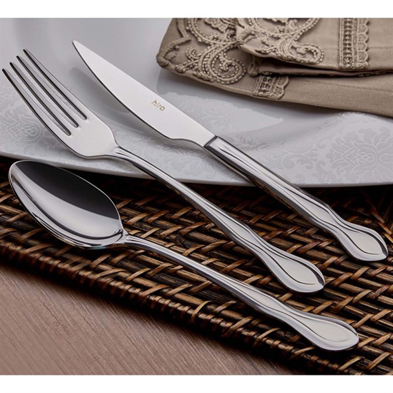 Комплект прибори от 24 части от серията Milano на турската марка HIRA с атрактивна визия, подходящ за шест души.Комплектът съдържа 6 лъжици, 6 вилици, 6 ножа и 6 десертни лъжички.Приборите са в сребрист цвят и с интересни извивки в долната част на дръжките.Изработени са от неръждаема стомана тип 304 (с дебелина 3 мм при вилиците и лъжиците, 10 мм при ножовете и 2.5 мм при десертните лъжички).0тличават се със здравина и дълъг експлоатационен срок.При спазване на препоръките за употреба приборите запазват своя блясък и стилен вид както в първия ден.Вилиците и лъжиците са с дължина 20.2 см, ножовете - 22 см, а десертните лъжички - 16.5 см.*Могат да се мият в съдомиялна машина, на деликатна програма.