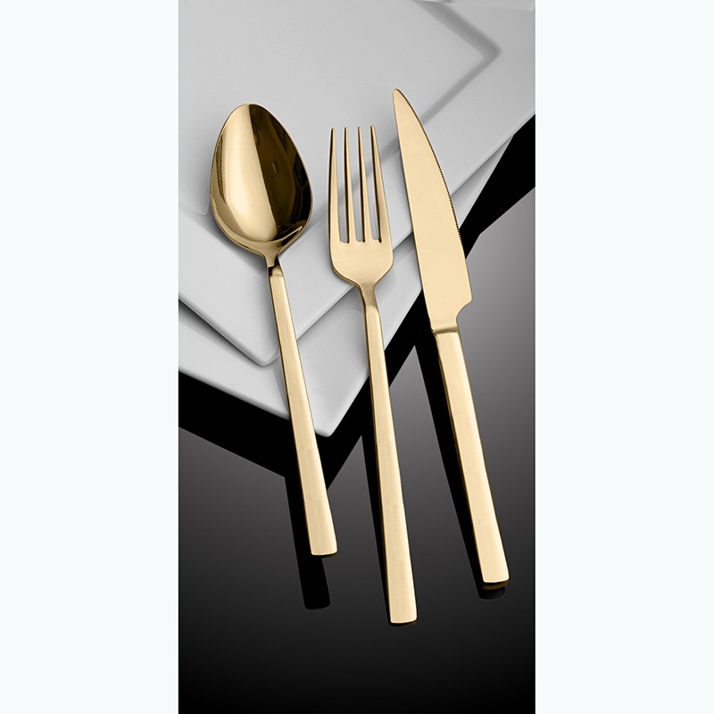 Комплект прибори от 24 части от серията Cubuk на турската марка HIRA в златист цвят, подходящ за шест души.Комплектът съдържа 6 лъжици, 6 вилици, 6 ножа и 6 десертни лъжички.Приборите са изработени от неръждаема стомана тип 304 (с дебелина 3 мм при вилиците и лъжиците, 10 мм при ножовете и 2.5 мм при десертните лъжички).Отличават се с естетичен дизайн, модерен външен вид, здравина и дълъг експлоатационен срок.Имат отлична устойчивост на корозия, лесни са за миене и съхранение.Балансираното тегло и гладката повърхност осигуряват естетическо удоволствие при захващане и комфорт при държане на приборите.Комплектът е подходящ както за домашна употреба, така и за семейни събирания, сервиране на партита и др. Идеален за сватби или други празнични събития.Перфектен подарък за младо семейство или приятели.При спазване на препоръките за употреба приборите запазват своя блясък и стилен вид както в първия ден.Лъжиците и вилиците са с дължина 20.7 см, ножовете - 22 см, а десертните лъжички - 16.5 см.