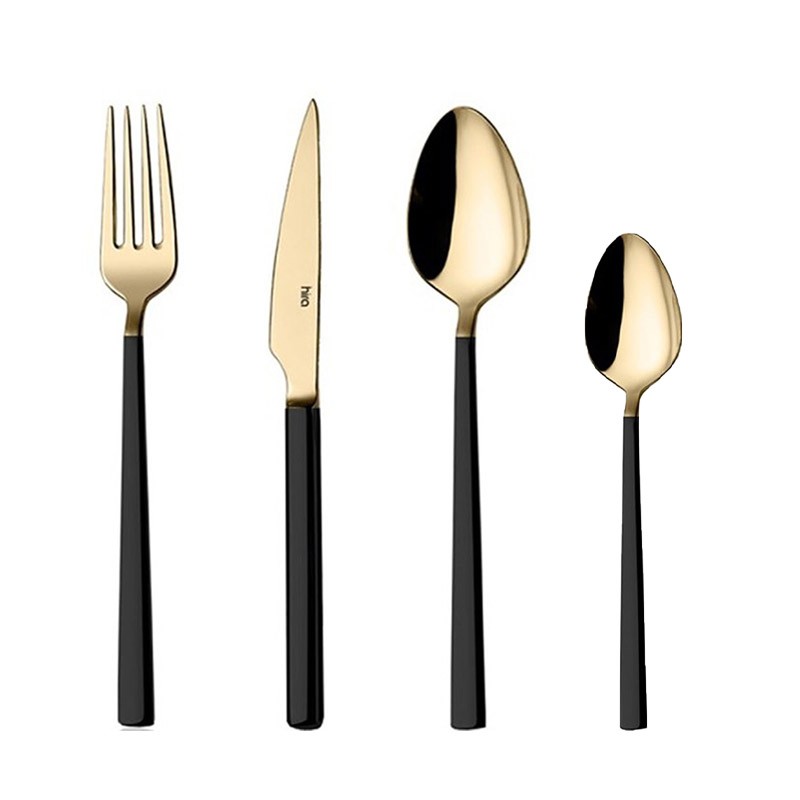 Комплект прибори от 24 части от серията Cubuk на турската марка HIRA със стилен дизайн, подходящ за шест души.Комплектът съдържа 6 лъжици, 6 вилици, 6 десертни лъжички и 6 ножа, в цвят златно и черно и с покритие тип седефено.Приборите са изработени от неръждаема стомана тип 304 (с дебелина 3 мм при лъжиците и вилиците, 10 мм при ножовете и 2.5 мм при десертните лъжички).0тличават се със здравина и дълъг експлоатационен срок.Идеален е както за дома, така и за сватби или други празнични събития.Перфектен подарък за младо семейство или приятели.При спазване на препоръките за употреба приборите запазват своя блясък и стилен вид както в първия ден.Лъжиците и вилиците са с дължина 20.7 см, ножовете - 22 см, а десертните лъжички - 16.5 см.