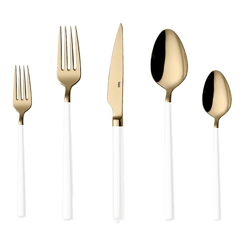 Комплект прибори от 30 части с атрактивна визия от серията Cubuk на турската марка HIRA, подходящ за шест души.Комплектът съдържа 6 лъжици, 6 вилици, 6 ножа, 6 десертни вилици и 6 десертни лъжички, в цвят злато и бяло.Приборите са изработени от неръждаема стомана тип 304 (с дебелина 3 мм при вилиците и лъжиците, 10 мм при ножовете и 2.5 мм при десертните вилици и лъжички).Отличават се с естетичен дизайн, модерен външен вид, здравина и дълъг експлоатационен срок.Имат отлична устойчивост на корозия, лесни са за миене и съхранение.Балансираното тегло и гладката повърхност осигуряват естетическо удоволствие при захващане и комфорт при държане на приборите.Комплектът е подходящ както за домашна употреба, така и за семейни събирания, сервиране на партита и др. Идеален е както за дома, така и за сватби или други празнични събития.Перфектен подарък за младо семейство или приятели.При спазване на препоръките за употреба приборите запазват своя блясък и стилен вид както в първия ден.Лъжиците и вилиците са с дължина 20.7 см, ножовете - 22 см, десертните вилици - 16.7 см, а десертните лъжички - 16.5 см.