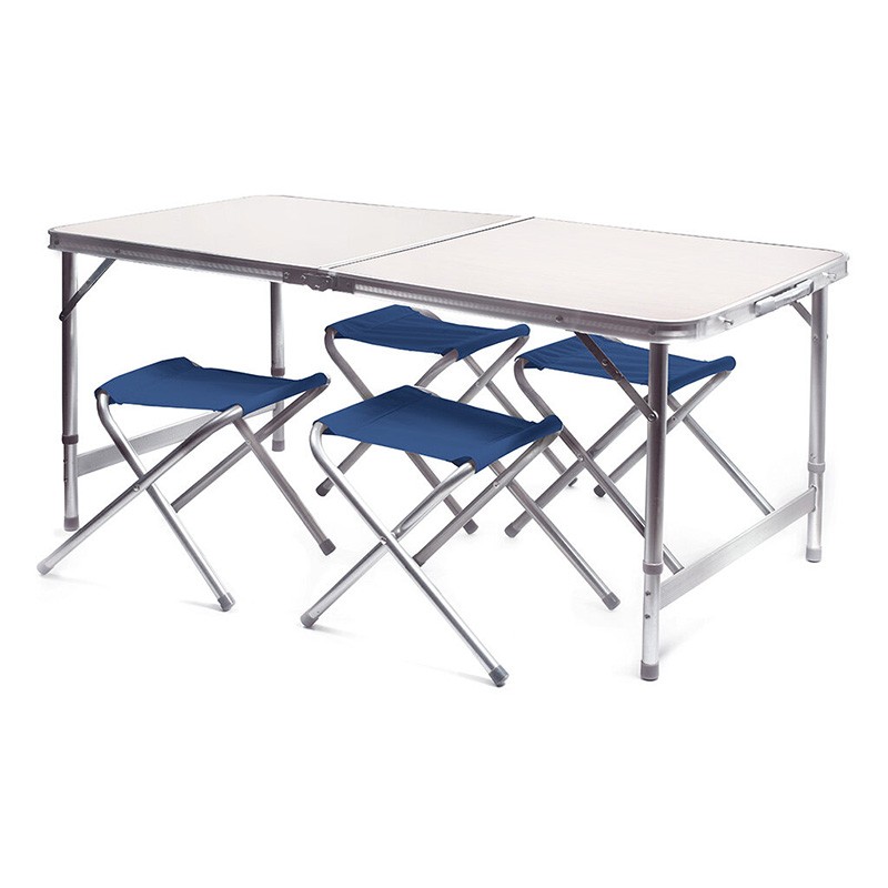 Този компактен къмпинг комплект е изработен от висококачествени материали, които гарантират дълготрайност и устойчивост на външни условия. Леката, но изключително стабилна алуминиева конструкция на масата и столовете осигурява надеждност, без да утежнява багажа ви. Специалното покритие на плота и седалките от пластмаса прави почистването бързо и лесно, а регулируемата височина на масата предлага допълнителна гъвкавост за различни дейности – от хранене до игри на открито.