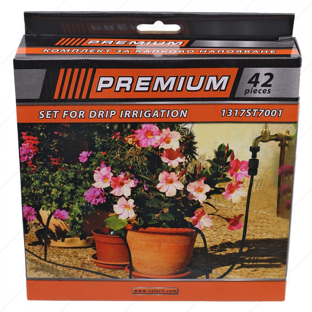 Комплект за капково напояване на фирма PREMIUMGARDEN е достатъчен за напояване на 15 бр. малки саксии, 15 бр. средно големи саксии или от 7 до 10 бр. големи саксии, както и за 7,5 м. жив плет или за 6 кв.м. площ. Свързва се директно към водоподаването - към чешма. Външният диаметър на маркуча е ф7 мм, а вътрешният диаметър е ф5 мм.