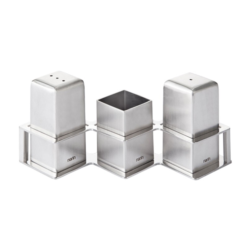 Комплектът съдържа: съд за сол- 1 бр., съд за пипер- 1 бр., съд за клечки за зъби-1 бр., поставка.
