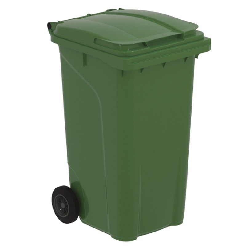 Kонтейнер за битови и промишлени отпадъци RG с вместимост 240 л, снабден с две колела и капак.Удобен за използване в домашни условия, както и при различните комунални дейности.Контейнерът е произведен от полиетилен с висока плътност.Материалът е устойчив на UV лъчи, високи и ниски температури.Кошът е устойчив на химически и биологически въздействия.Гладката му повърхност не позволява залепването и задържането на отпадъци. Кошът е с височина 1055 мм, дължина 575 мм, дълбочина 730 мм и диаметър на колелата 200 мм.Предлага се в зелен цвят.