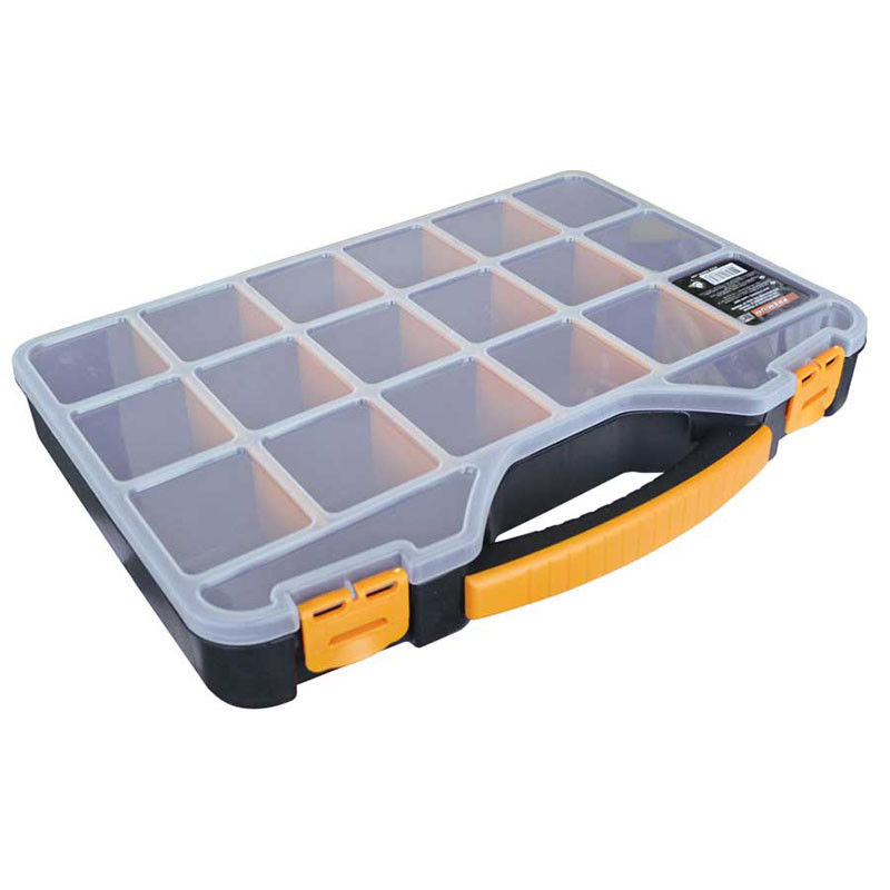 Куфар органайзер Premium с 18 отделения, с две закопчалки и удобна дръжка за пренасяне. Изработен е от висококачествена пластмаса и е с размер 18"/420 мм.В него можете да подредите всякакви дребни части като гайки, болтове, пирони, скоби и др., от които имате нужда по време на ремонт във вкъщи, в гаража или градината.
