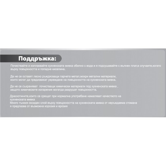 Кухненска мивка с едно корито, изработена от алпака. Мивката е предназначена за вграждане, произведена е с дължина 75 см, дълбочина 20 см и ширина 43 см, оборудвана е със сифон. Има опция за вграждане на дозатор за течен сапун, също така има опция за отвор за стоящ смесител.