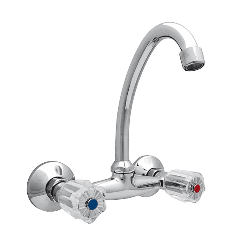 Кухненски смесител за мивка 7006-2D от серията Mesina на FORMA VITA, предназначен за стенен монтаж с два броя ексцентрици и розетки.Батерията е с керамични затварящи механизми и аератор.Има 5 години гаранция.