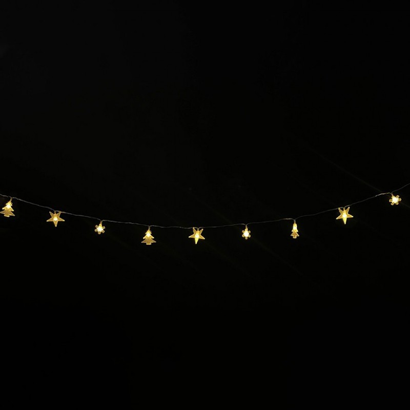 LED светещ гирлянд снежинка, звезда, елхичка на марката LIGHTEX, светещ с топло бяла светлина.Подходящ е за декорация на елха, стена, прозорец, тераса, балкон. LED гирляндът се характеризира с мощност 0.39 W и степен на влагозащита IP20.Работи с две батерии AA 1.5 V (не са включени в комплекта) и е с дължина 1.65 м.Оборудван е с 10 LED лампи с живот до 50 000 часа.Снежинките, звездите и елхичките са изработени от пластмаса.Оригинално и ефектно LED осветление, с което ще направите Коледните и Новогодишните празници още по-приказни и незабравими.