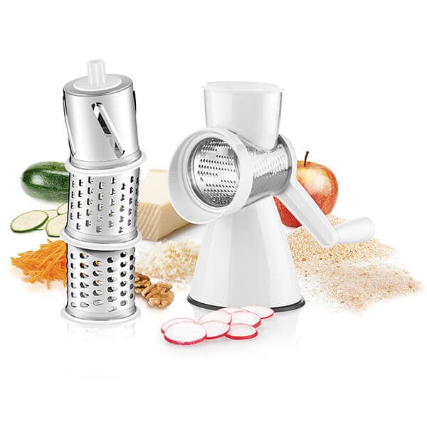 Комплекта включва четири различни барабана за смилане на тестени изделия на трохи, за стъргане и рязане на фино и едро на зеленчуци, за рязане на жулиени, за смилане на ядки, шоколад, сирене и други. С приставка за предпазване на пръстите. Бързо и стабилно захващане за повърхността чрез ръчка за вакуумно закрепяне. Изработена от специално закалена устойчива пластмаса и барабани от висок клас неръждаема стомана. Размери: Ø13xH25cm. Не е подходяща за почистване в съдомиялна машина.