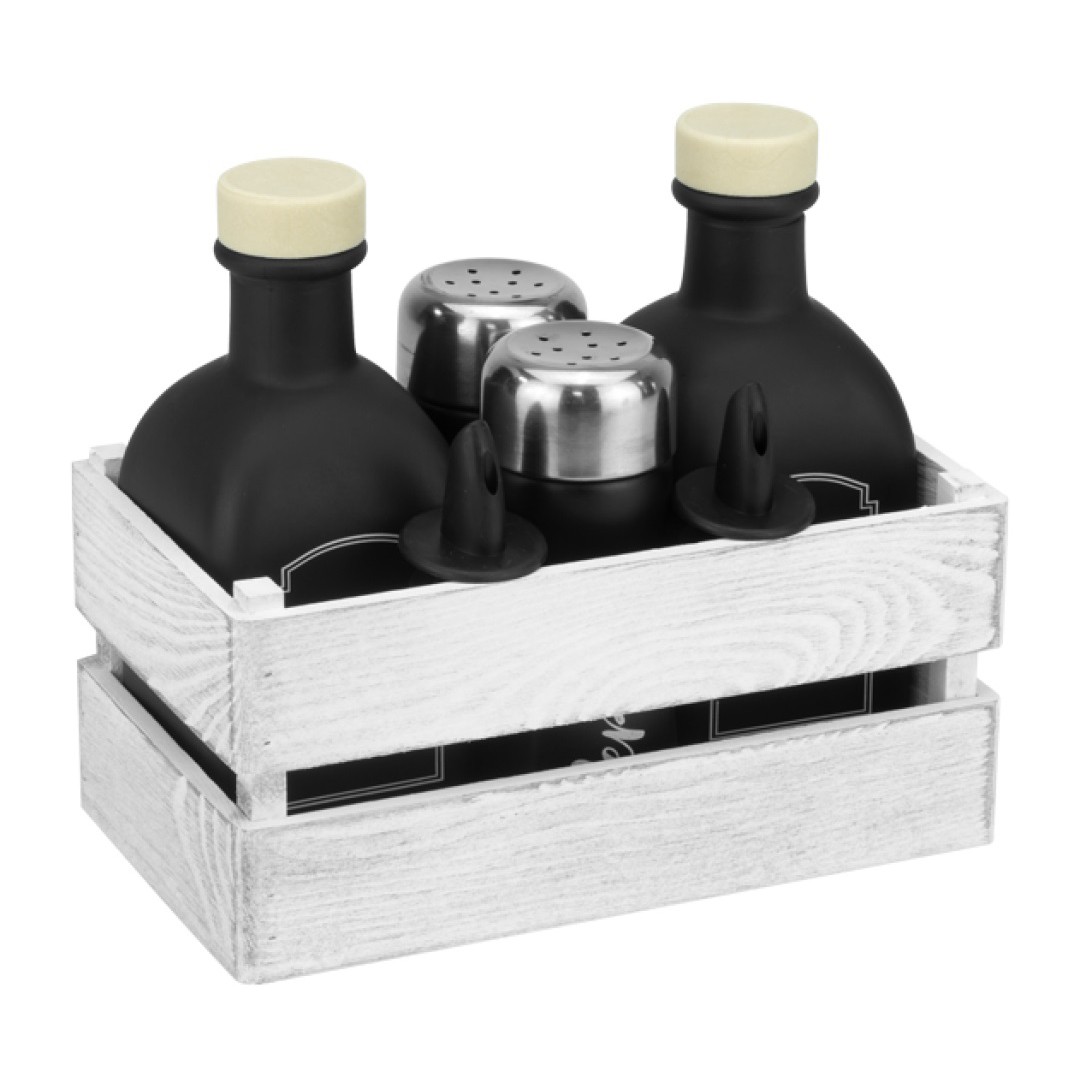 Стилен оливерник от 5 части Old Fashioned Black HORECANO в дървена касетка във винтидж бяло.Комплектът включва стъклени бутилки за олио/зехтин и оцет с вместимост 250 мл и стъклени солница и пиперница с метални сребристи капачки с вместимост 80 мл.И четирите съда са в черен цвят.В комплекта са включени и черни пурери за бутилките.Удобната касетка прави комплекта лесен за пренасяне и съхранение.Практичен и модерен оливерник, чудесно предложение за всяка кухня.