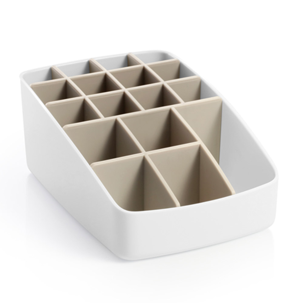 Предназначен за съхранение и лесна организация на очни спирали, червила и други дребни козметични продукти и аксесоари