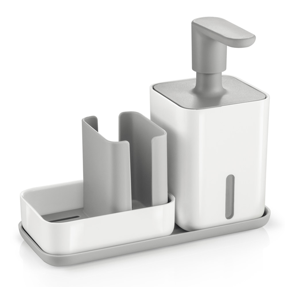 Предназначен за организиране на пространството около мивката Комплектът съдържа: - дозатор за течен сапун или препарат за почистване на съдове, който се пълни изключително лесно - поставка за гъба и кърпа, която се разглобява, за да съхне бързо и да бъде лесна за почистване - подложка с покритие против плъзгане Изработен от устойчива пластмаса Размери: 20x8.5xH17cm Не е подходящ за почистване в съдомиялна машина
