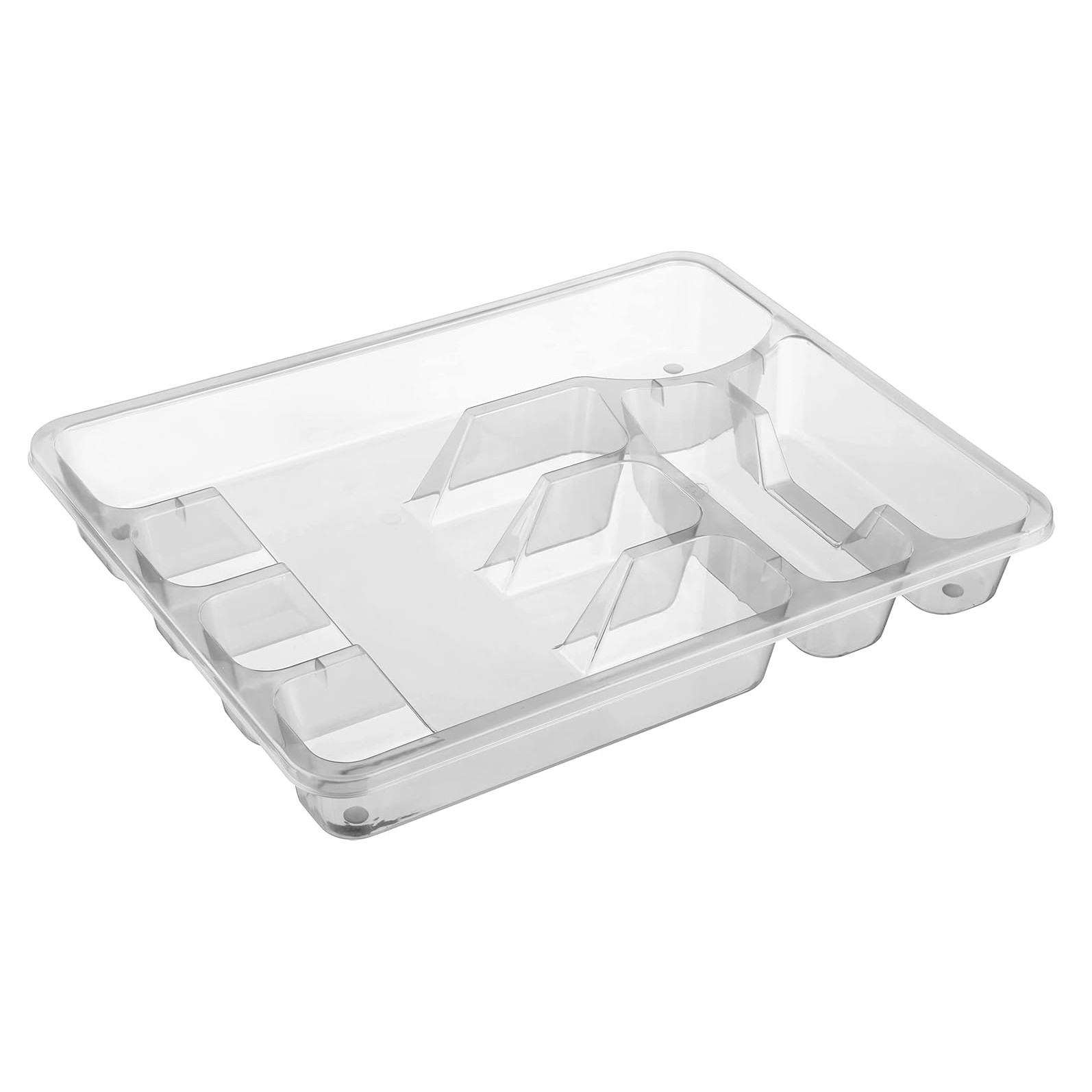 Пластмасов прозрачен органайзер за прибори на марката BERRA с 6 отделения, предназначен за чекмедже.Разполага с три отделения за вилици, лъжици и ножове, два малки и един голям участък за други прибори за хранене и готвене.Органайзерът е с размери 37.5x30 см.Почиства се бързо и лесно.Разпределителят ще ви помогне всички прибори да изглеждат добре подредени, като същевременно са на една ръка разстояние при необходимост.