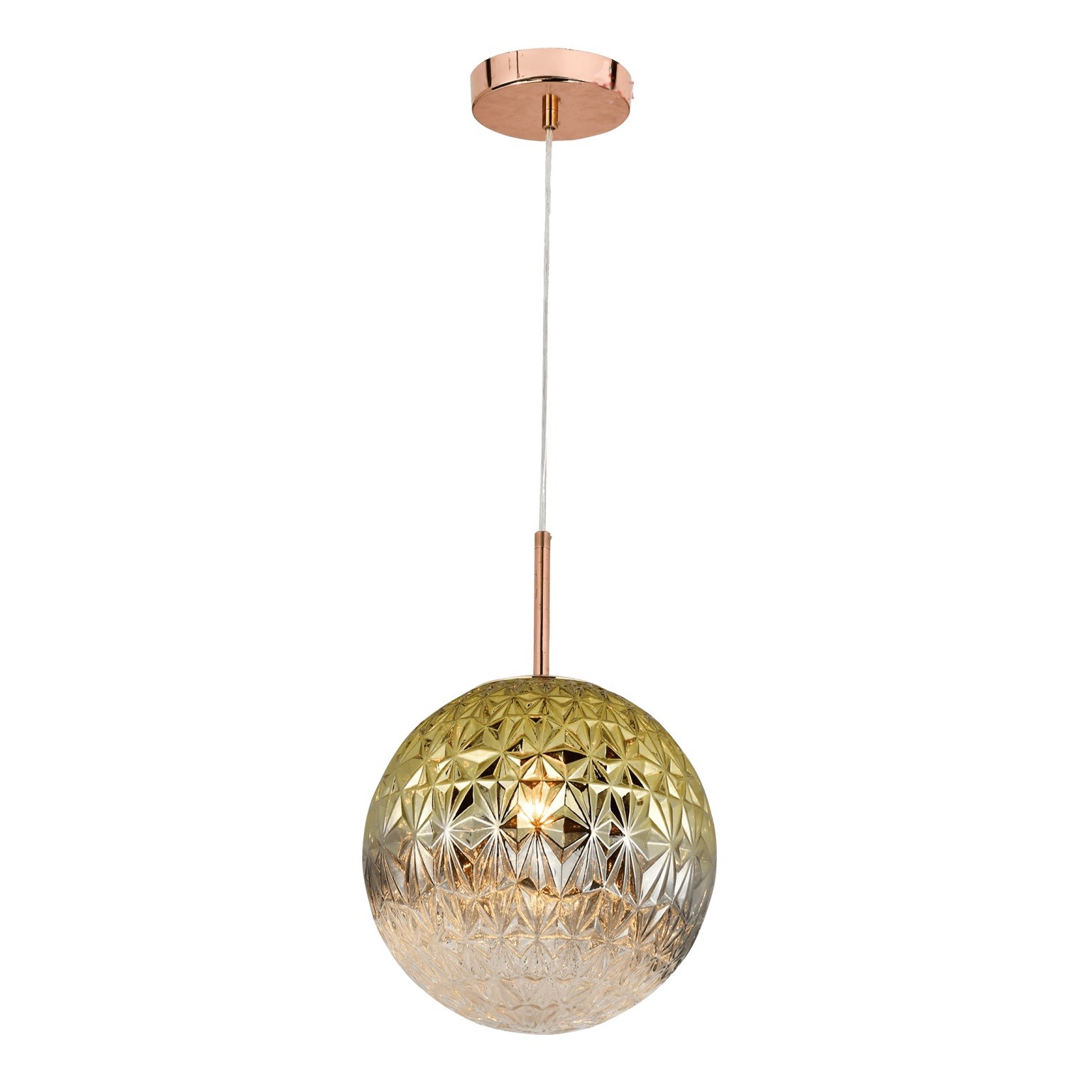 Изящен сферичен абажур GS-619872 на марката GAUSS с релефна повърхност в златист цвят.Проектиран е за една крушка с цокъл E27.Висящото осветително тяло е с размери: 32x32x35 см.Абажур с впечатляващ дизайн, който ще внесе интересен щрих в интериора на вашия дом.