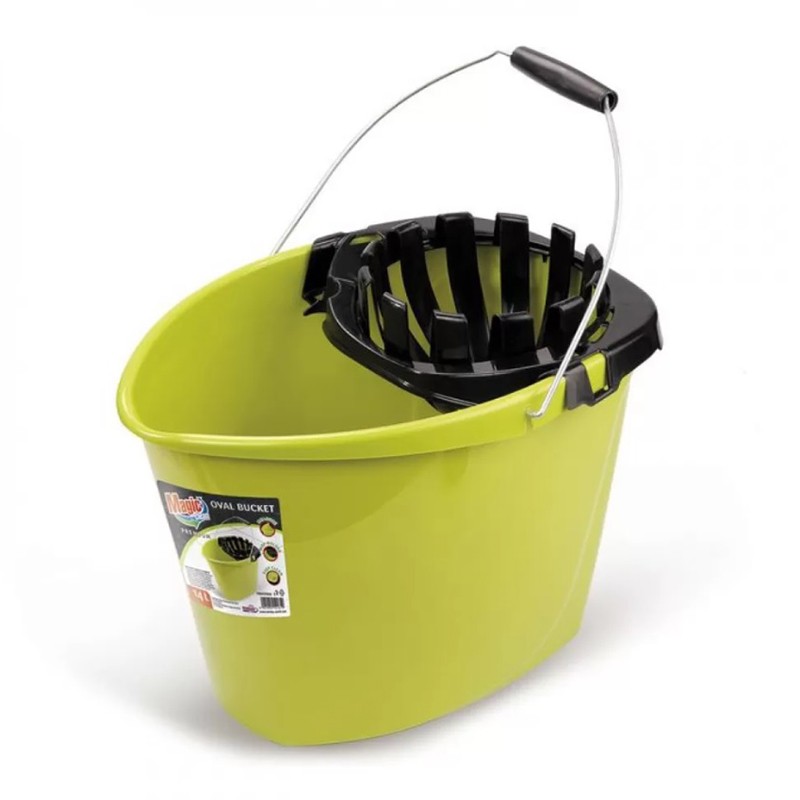 Овална кофа с цедка MAGIC CLEAN PREMIUM с подвижна гъвкава цедка, подходяща за разтваряне на препарати за почистване.Изработена е от здрав и устойчив пластмасов материал и е с метална дръжка с държач.Има мерителна скала от вътрешната страна.Кофата е с вместимост 14 л.