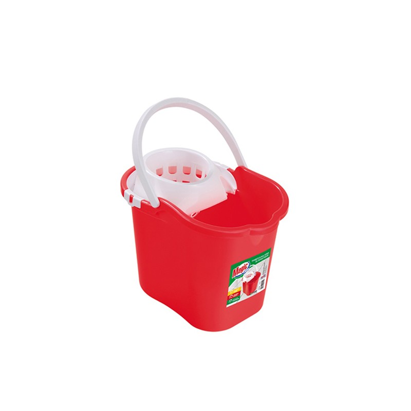 Овална кофа с цедка MAGIC CLEAN, подходяща за разтваряне на препарати за почистване.Изработена е от здрав и устойчив пластмасов материал в червен цвят.Подходяща е за използване с всички видове мопове за под. Кофата е с вместимост 16 л.