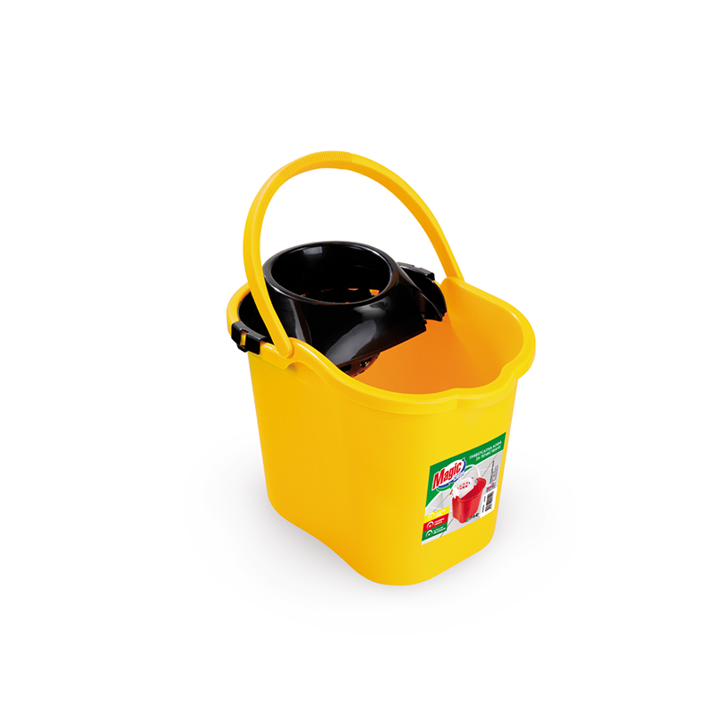 Овална кофа с цедка MAGIC CLEAN, подходяща за разтваряне на препарати за почистване.Изработена е от здрав и устойчив пластмасов материал в жълт цвят.Подходяща е за използване с всички видове мопове за под. Кофата е с вместимост 16 л.