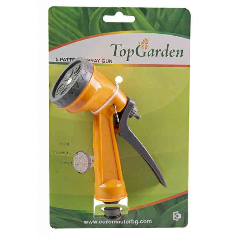 Пистолет за пръскане на марката Top Garden с 5 режима на поливане, като всеки един предоставя различна форма на струята.Има възможност за плавно регулиране на струята.Пистолетът е пластмасов, компактен модел, с присъединителен размер 1/2 ".