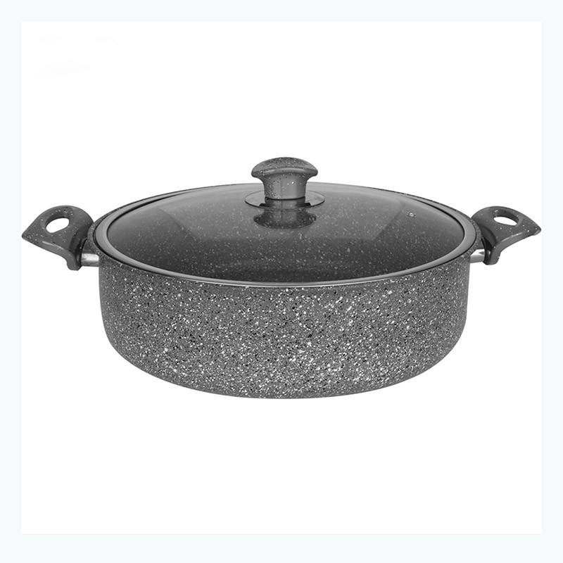 Плитка тенджера SN342 на турския производител MENZIR с незалепващо гранитно покритие от вътрешната страна, идеална за здравословно готвене.Подходяща е за приготвяне на всякакви основни ястия, за варене, за печене, за забъркване на кремове и сосове.Изработена е от висококачествен алуминий, с трислойно вътрешно покритие, изключително устойчиво на надраскване. Снабдена е със стъклен капак с отвор за парата и с топлоустойчиви, бакелитни дръжки в същия цвят като тялото на съда. Тенджерата е в сив цвят, с диаметър 20 см и височина 8 см.Подходяща е за съдомиялна машина.Качествена, удобна и практична тенджера, подходяща за всеки любител кулинар, който обича да гощава семейството си с вкусни ястия.