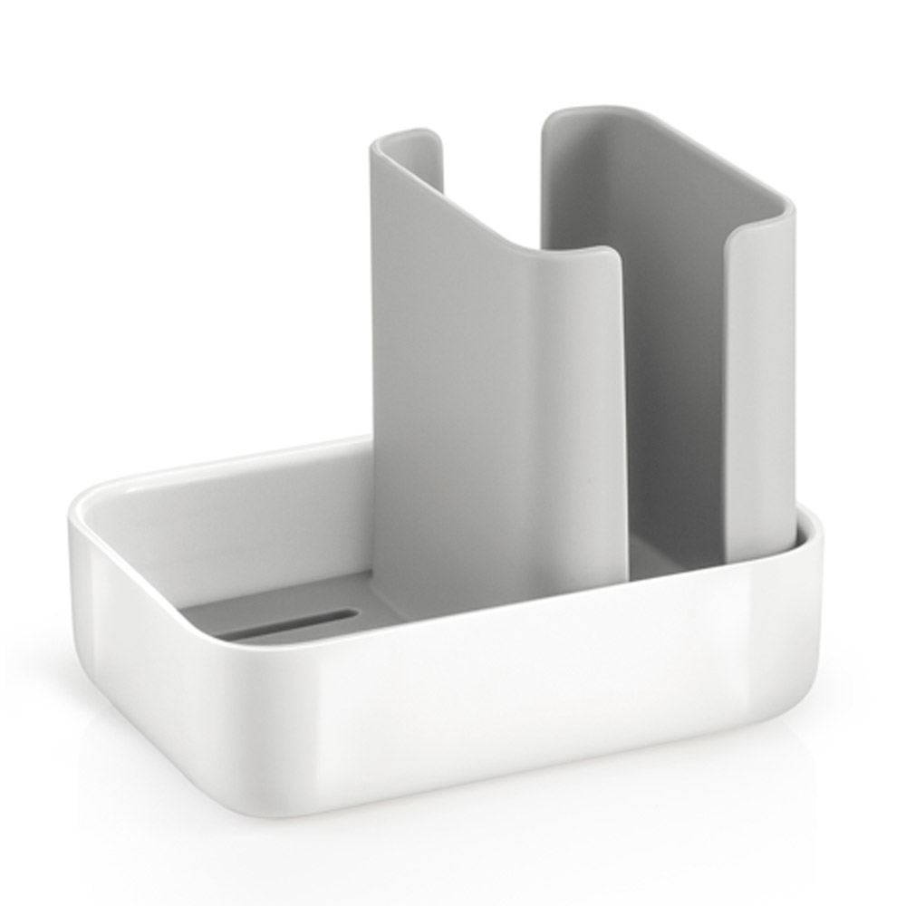 Предназначена за подреждане и съхранение на гъби и кърпи за почистване на съдове и на пространството около мивката Приставката за отцеждане се изважда и така може лесно да бъде почистена, а и да изсъхне по-бързо след това Изработена от устойчива пластмаса, с покритие против плъзгане