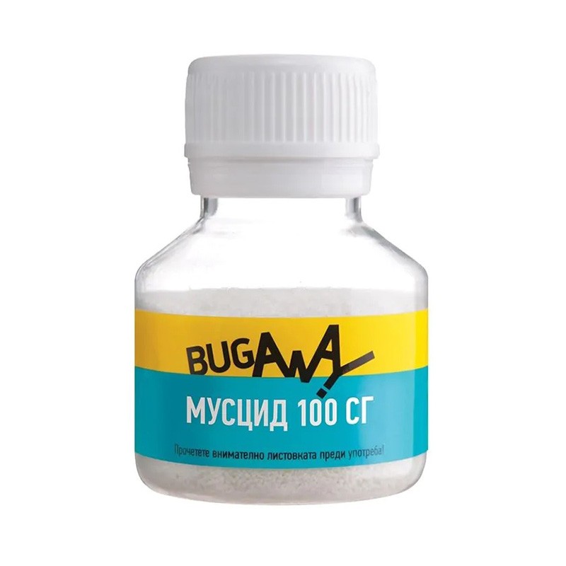 Препарат против мухи МУСЦИД 100 СГ, подходящ за ползване както в открити, така и в закрити помещения. Може да бъде използван в жилищни, обществени и промишлени сгради, както и в животновъдни ферми.В съдържанието на препарата са включени привличащи феромони, както и хранителни примамки. Насекомите, привлечени от действието на препарата, умират при контакт с повърхността, където се съдържа той.Обработва се около прозорците или вратите на помещенията, стените, където мухите кацат или преминават. Прилага се чрез намазване или чрез опръскване, като един флакон от 25 гр е достатъчен за 10 м² обработена площ. Ако предпочитате да извършвате превенцията чрез намазване, трябва да направите разтвор, като долеете вода във флакона. Върху чиста и осветена повърхност трябва да намажете с четка три петна със средна големина 10х30 см.Ако смятате да пръскате с препарата, трябва да смесите съдържанието с 250 мл вода.С готовия разтвор обработвате местата, където мухите кацат, а площта, която трябва да третирате, е ⅓ от цялата.Продуктът осигурява защита до 3 месеца след третиране.Обработката може да се повтори през 1 до 3 месеца, в зависимост от нивото на заразяване.