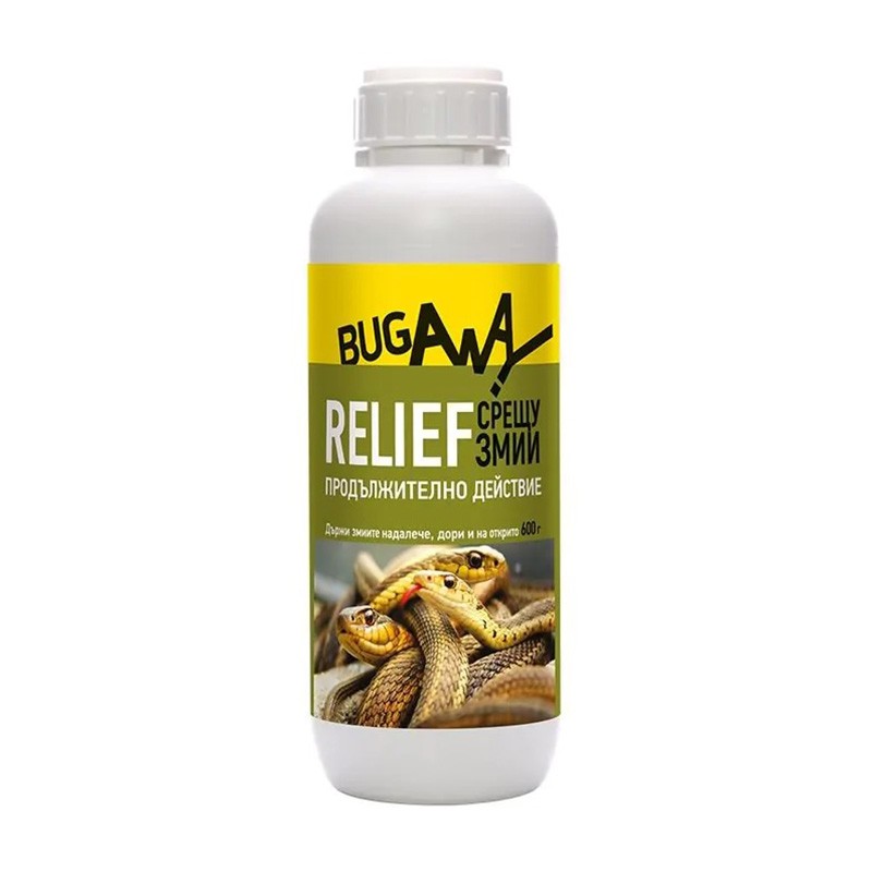 Препарат против змии и гущери RELIEF под формата на суха, ароматна гранула, създаваща силна ароматна бариера на местата, на които е поставена.Прогонва влечугите на база силен аромат, създаден от етерични масла. RELIEF прогонва, но не наранява змиите и не причинява вреда на други животни и околната среда.Поръсва се тънък слой от препарата по пътечките на влечугите или там където се предполага, че пребивават. Обикновено това са места със струпани камъни, алпинеуми, дърва за огрев, не окосени и поддържани дворове.Един флакон от препарата против змии е достатъчен за ивица с дължина около 100 метра. Повтаряйте третирането на всеки две седмици или след всеки силен дъжд.По време на работа да не се яде, пие и пуши. При контакт с кожата измийте с вода и сапун.